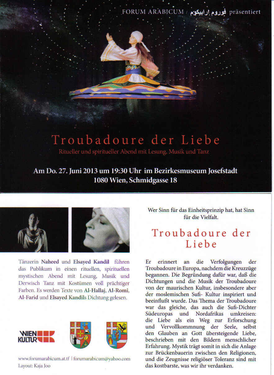 Tänzerin Naheed und der Schauspieler Elsayed Kandil führen das Publikum in einen rituellen, spirituellen mystischen Abend mit Lesung, Gesang, Derwisch Tanz mit Kostümen voll prächtiger Farben.